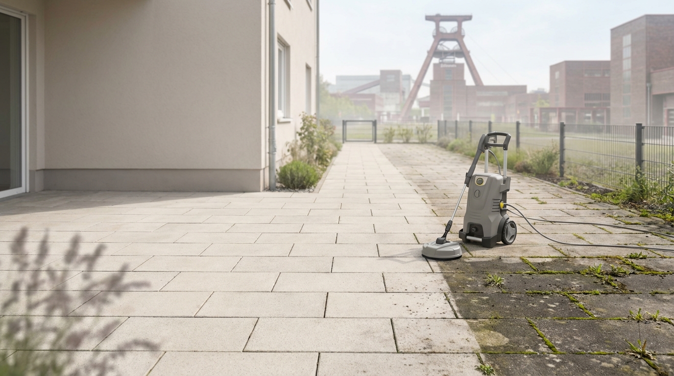 Wir reinigen Außenflächen wie Terrasse, Einfahrt und Zuwege je nach Material (z. B. Pflaster, Naturstein) mit abgestimmten Verfahren – inklusive sichtbarer Vorher/Nachher-Abnahme.